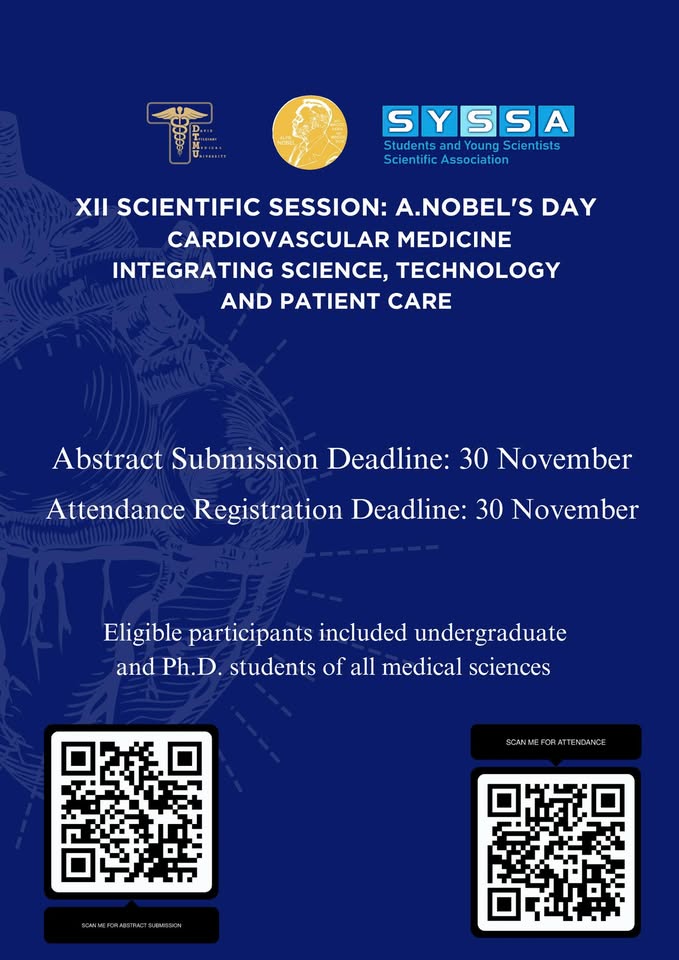 Join us at the annual scientific session organized by the Students’ and Young Scientists’ Scientific Association (SYSSA), dedicated to celebrating major achievements in modern science and medicine as well as the historical impact of the Nobel Prize.